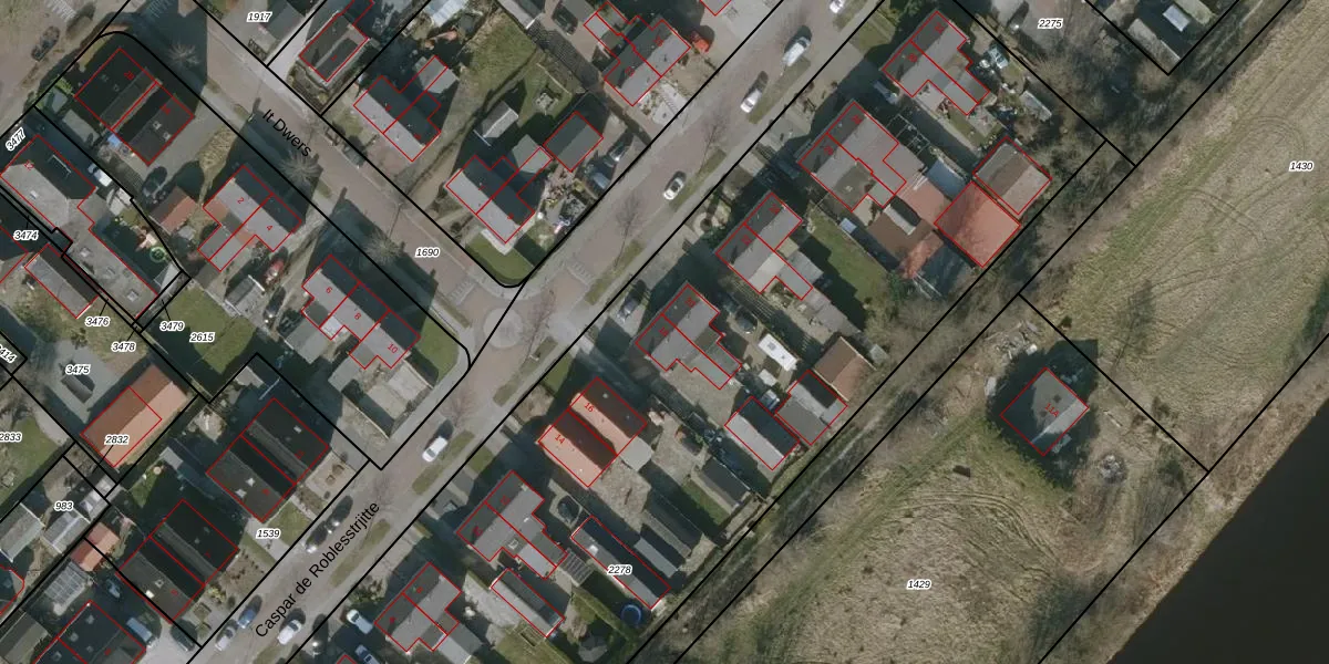 Het perceel waarop Caspar de Roblesstrjitte 18 staat heeft een oppervlakte van 5920 m². Dit is een zeer groot perceel. De perceeloppervlakte wordt geregistreerd door het Kadaster. Gedetailleerde informatie over de maten van dit perceel kunt u vinden in het rapport Kadastrale kaart met maatvoering van Caspar de Roblesstrjitte 18.