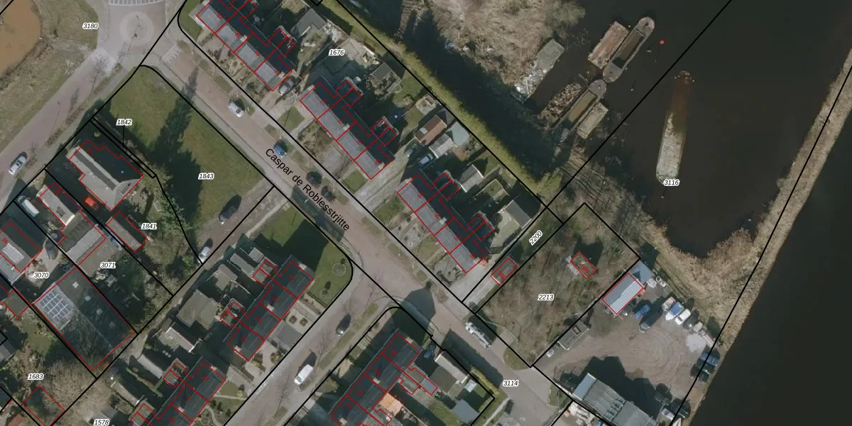 Het perceel waarop Caspar de Roblesstrjitte 64 staat heeft een oppervlakte van 2850 m². Dit is een zeer groot perceel. De perceeloppervlakte wordt geregistreerd door het Kadaster. Gedetailleerde informatie over de maten van dit perceel kunt u vinden in het rapport Kadastrale kaart met maatvoering van Caspar de Roblesstrjitte 64.