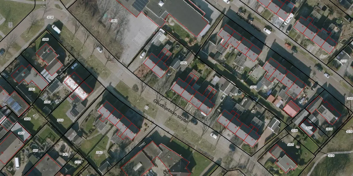 Het perceel waarop Goudtsjeblom-strjitte 16 staat heeft een oppervlakte van 2570 m². Dit is een zeer groot perceel. De perceeloppervlakte wordt geregistreerd door het Kadaster. Gedetailleerde informatie over de maten van dit perceel kunt u vinden in het rapport Kadastrale kaart met maatvoering van Goudtsjeblom-strjitte 16.