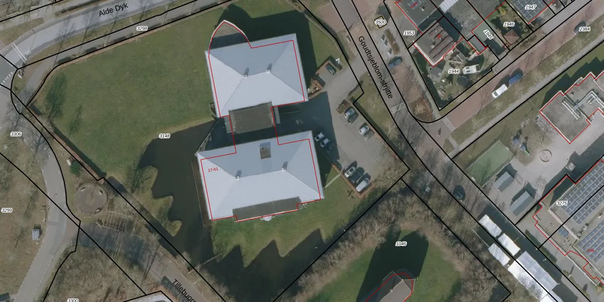 Het perceel waarop Goudtsjeblom-strjitte 17 staat heeft een oppervlakte van 7865 m². Dit is een zeer groot perceel. De perceeloppervlakte wordt geregistreerd door het Kadaster. Gedetailleerde informatie over de maten van dit perceel kunt u vinden in het rapport Kadastrale kaart met maatvoering van Goudtsjeblom-strjitte 17.