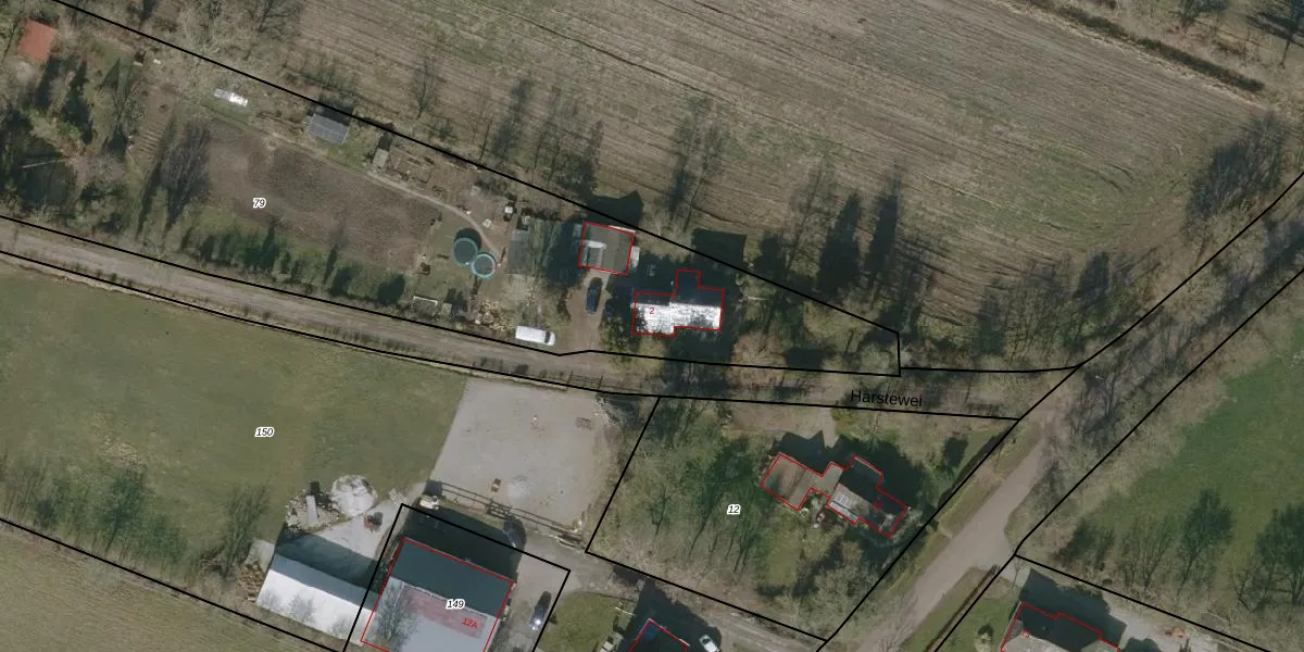 Het perceel waarop Harstewei 2 staat heeft een oppervlakte van 5050 m². Dit is een zeer groot perceel. De perceeloppervlakte wordt geregistreerd door het Kadaster. Gedetailleerde informatie over de maten van dit perceel kunt u vinden in het rapport Kadastrale kaart met maatvoering van Harstewei 2.