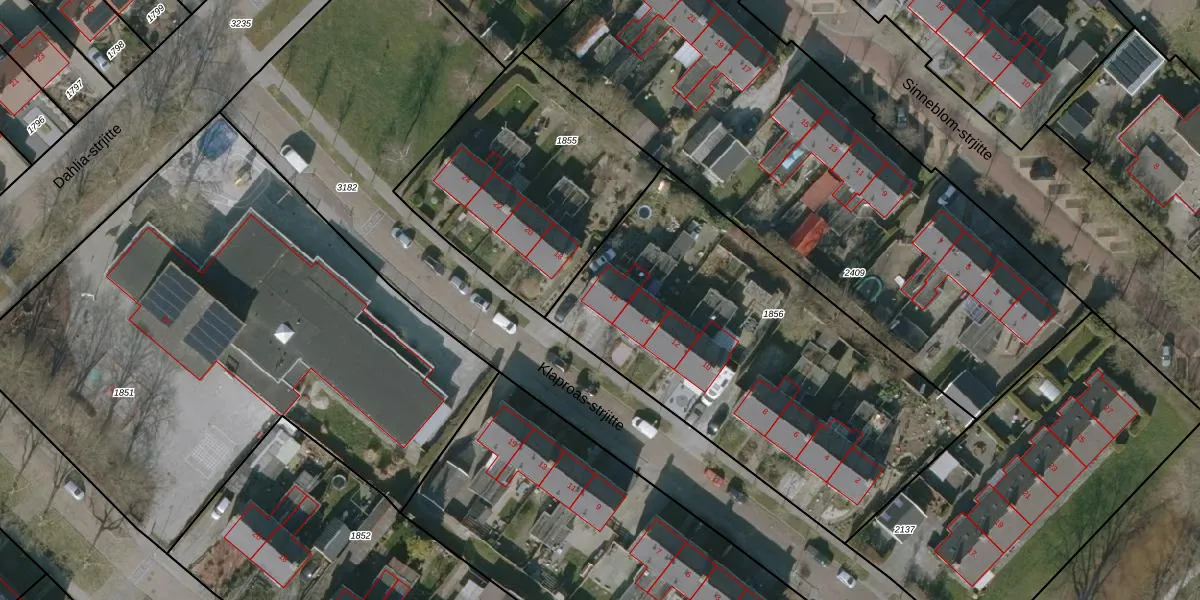 Het perceel waarop Klaproas-strjitte 16 staat heeft een oppervlakte van 1930 m². Dit is een zeer groot perceel. De perceeloppervlakte wordt geregistreerd door het Kadaster. Gedetailleerde informatie over de maten van dit perceel kunt u vinden in het rapport Kadastrale kaart met maatvoering van Klaproas-strjitte 16.