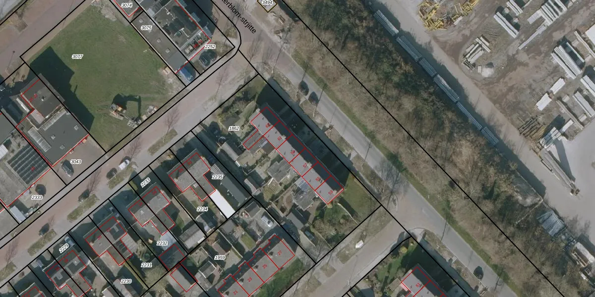 Het perceel waarop Pinksterblom-strjitte 59 staat heeft een oppervlakte van 1810 m². Dit is een zeer groot perceel. De perceeloppervlakte wordt geregistreerd door het Kadaster. Gedetailleerde informatie over de maten van dit perceel kunt u vinden in het rapport Kadastrale kaart met maatvoering van Pinksterblom-strjitte 59.
