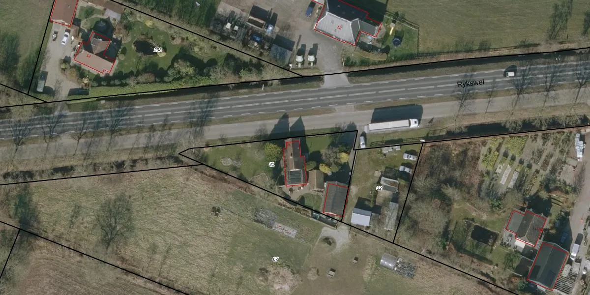 Het perceel waarop Rykswei 15 staat heeft een oppervlakte van 965 m². Dit is een groot perceel. De perceeloppervlakte wordt geregistreerd door het Kadaster. Gedetailleerde informatie over de maten van dit perceel kunt u vinden in het rapport Kadastrale kaart met maatvoering van Rykswei 15.