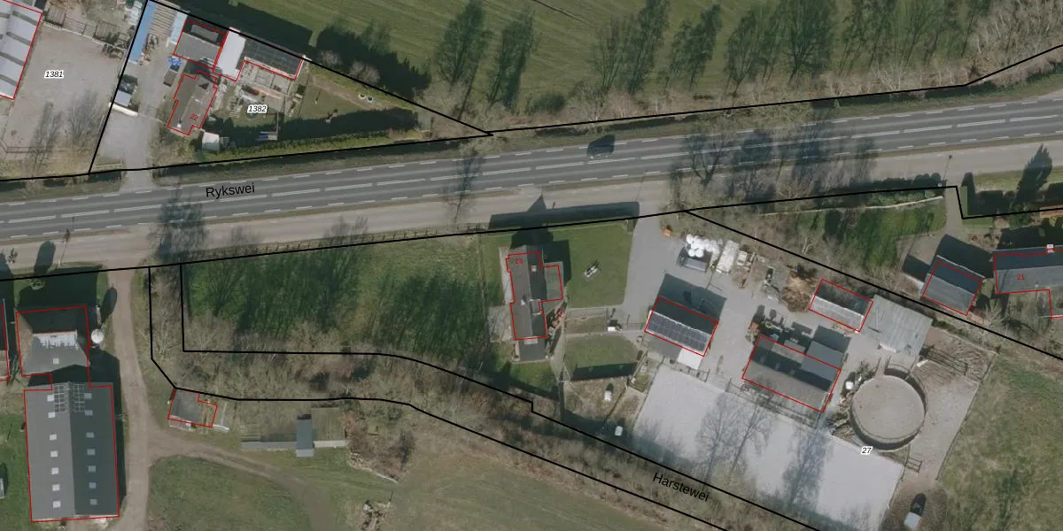 Het perceel waarop Rykswei 23 staat heeft een oppervlakte van 7545 m². Dit is een zeer groot perceel. De perceeloppervlakte wordt geregistreerd door het Kadaster. Gedetailleerde informatie over de maten van dit perceel kunt u vinden in het rapport Kadastrale kaart met maatvoering van Rykswei 23.