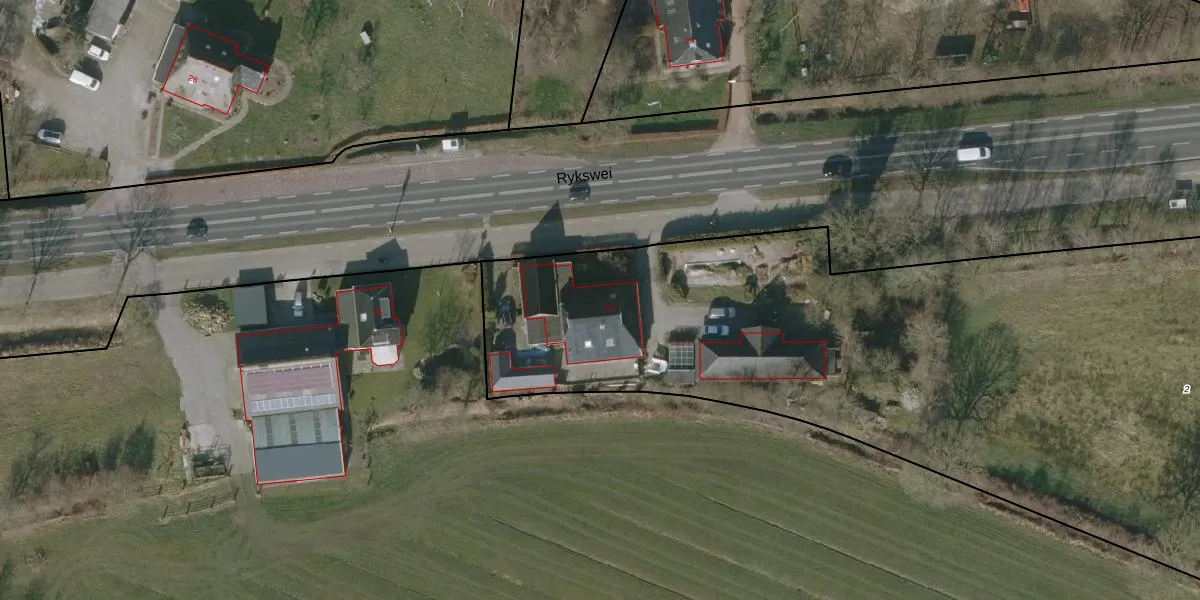 Het perceel waarop Rykswei 33 staat heeft een oppervlakte van 8210 m². Dit is een zeer groot perceel. De perceeloppervlakte wordt geregistreerd door het Kadaster. Gedetailleerde informatie over de maten van dit perceel kunt u vinden in het rapport Kadastrale kaart met maatvoering van Rykswei 33.