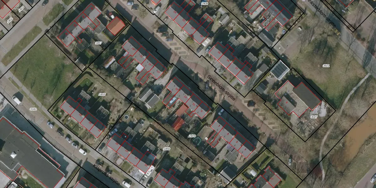 Het perceel waarop Sinneblom-strjitte 13 staat heeft een oppervlakte van 2823 m². Dit is een zeer groot perceel. De perceeloppervlakte wordt geregistreerd door het Kadaster. Gedetailleerde informatie over de maten van dit perceel kunt u vinden in het rapport Kadastrale kaart met maatvoering van Sinneblom-strjitte 13.