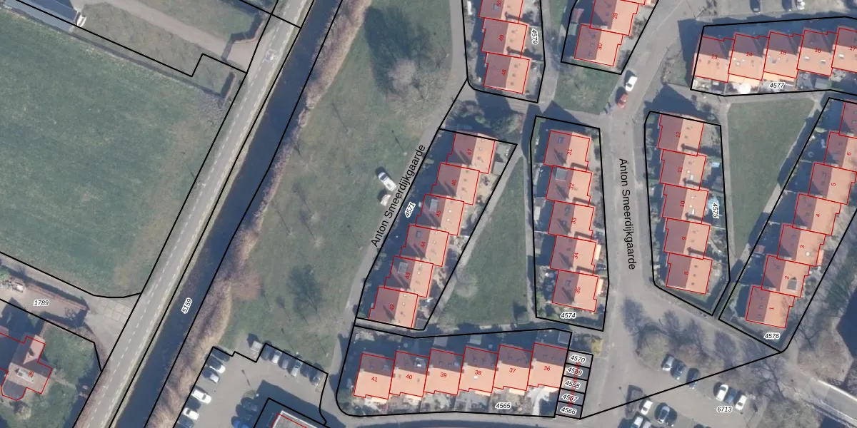 Het perceel waarop Anton Smeerdijkgaarde 45 staat heeft een oppervlakte van 845 m². Dit is een groot perceel. De perceeloppervlakte wordt geregistreerd door het Kadaster. Gedetailleerde informatie over de maten van dit perceel kunt u vinden in het rapport Kadastrale kaart met maatvoering van Anton Smeerdijkgaarde 45.