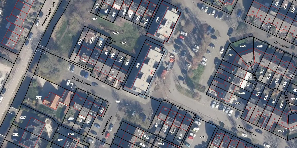 Het perceel waarop het adres ligt is KTH00-B-5711. De afkorting 'KTH00' staat voor kadastrale gemeente Kortenhoef. Het perceel is 540 m² groot. Dat is kleiner dan de gemiddelde perceeloppervlakte in Kortenhoef, dat op 683,39 m² ligt. De grootste perceeloppervlakte in de kadastrale gemeente is 7,2 ha. De kleinste oppervlakte bedraagt 0 m². Er zijn 18 adressen aanwezig op het perceel. De huidige grenzen van het perceel zijn digitaal in de Basisregistratie Kadaster (BRK) geregistreerd op 26-09-2011.