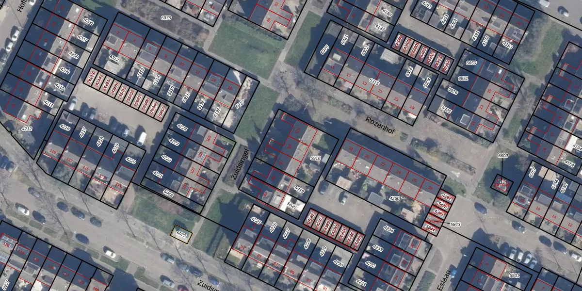 Het perceel waarop Zuidsingel 99 staat heeft een oppervlakte van 427 m². Dit is een groot perceel. De perceeloppervlakte wordt geregistreerd door het Kadaster. Gedetailleerde informatie over de maten van dit perceel kunt u vinden in het rapport Kadastrale kaart met maatvoering van Zuidsingel 99.