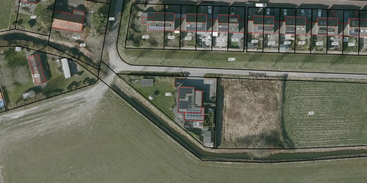 Spuiweg 6 is gelegen op kadastraal perceel KGN00K259. Deze kadastrale aanduiding is uniek en wordt gebruikt door het Kadaster om eigendomsrechten en andere zakelijke rechten vast te leggen. Het perceel maakt onderdeel uit van de kadastrale gemeente Kortgene.