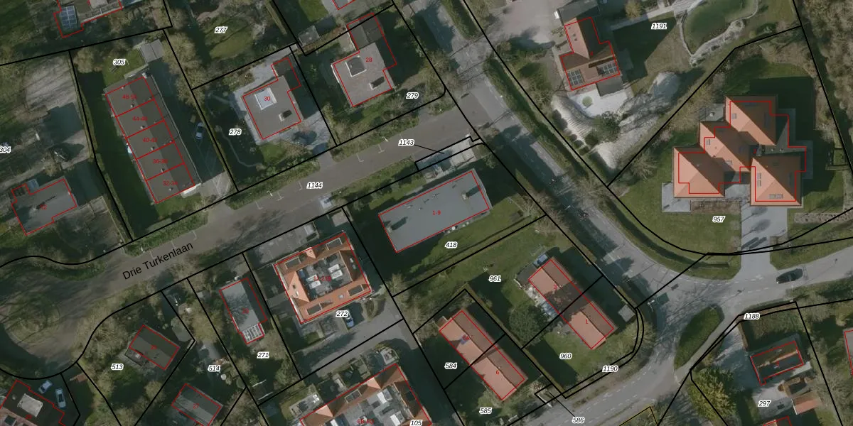 Drie Turkenlaan 7 is gelegen op kadastraal perceel VKN00M418. Deze kadastrale aanduiding is uniek en wordt gebruikt door het Kadaster om eigendomsrechten en andere zakelijke rechten vast te leggen. Het perceel maakt onderdeel uit van de kadastrale gemeente Valkenisse.