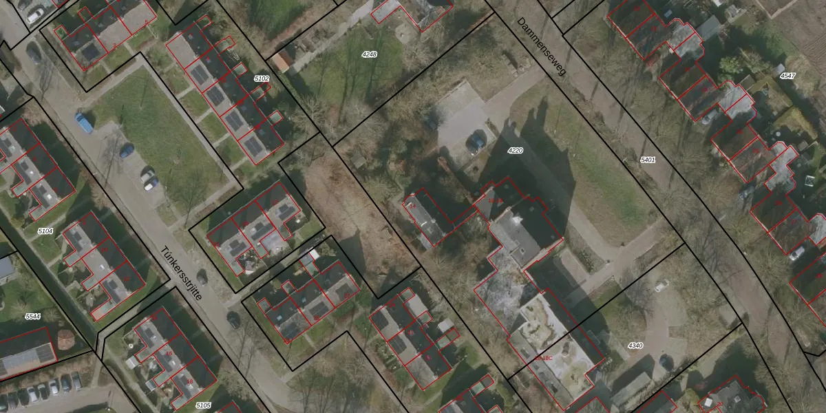 Het perceel waarop Dammenseweg 14 staat heeft een oppervlakte van 3841 m². Dit is een zeer groot perceel. De perceeloppervlakte wordt geregistreerd door het Kadaster. Gedetailleerde informatie over de maten van dit perceel kunt u vinden in het rapport Kadastrale kaart met maatvoering van Dammenseweg 14.
