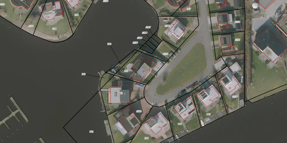 De Stringen 20 is gelegen op kadastraal perceel KDM00L751. Deze kadastrale aanduiding is uniek en wordt gebruikt door het Kadaster om eigendomsrechten en andere zakelijke rechten vast te leggen. Het perceel maakt onderdeel uit van de kadastrale gemeente Koudum.
