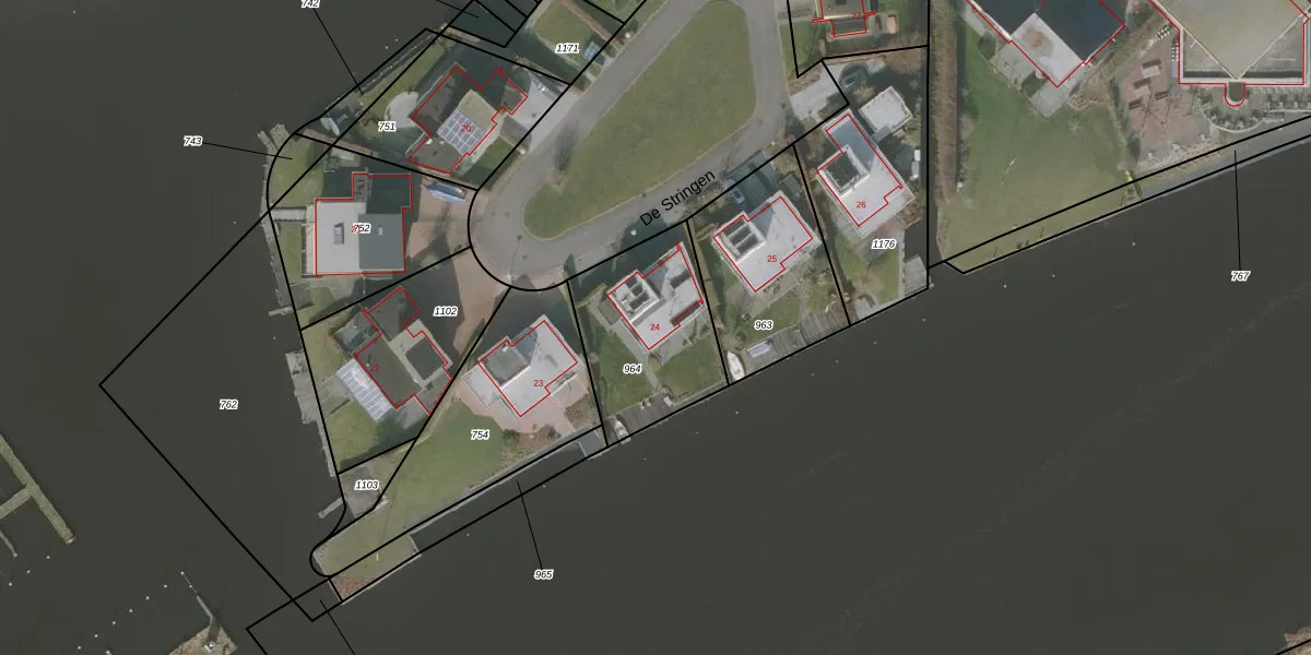 De Stringen 24 is gelegen op kadastraal perceel KDM00L964. Deze kadastrale aanduiding is uniek en wordt gebruikt door het Kadaster om eigendomsrechten en andere zakelijke rechten vast te leggen. Het perceel maakt onderdeel uit van de kadastrale gemeente Koudum.
