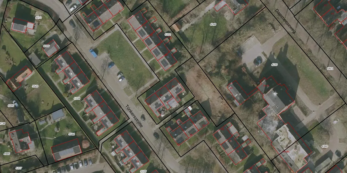 Het perceel waarop Túnkersstrjitte 17 staat heeft een oppervlakte van 1965 m². Dit is een zeer groot perceel. De perceeloppervlakte wordt geregistreerd door het Kadaster. Gedetailleerde informatie over de maten van dit perceel kunt u vinden in het rapport Kadastrale kaart met maatvoering van Túnkersstrjitte 17.