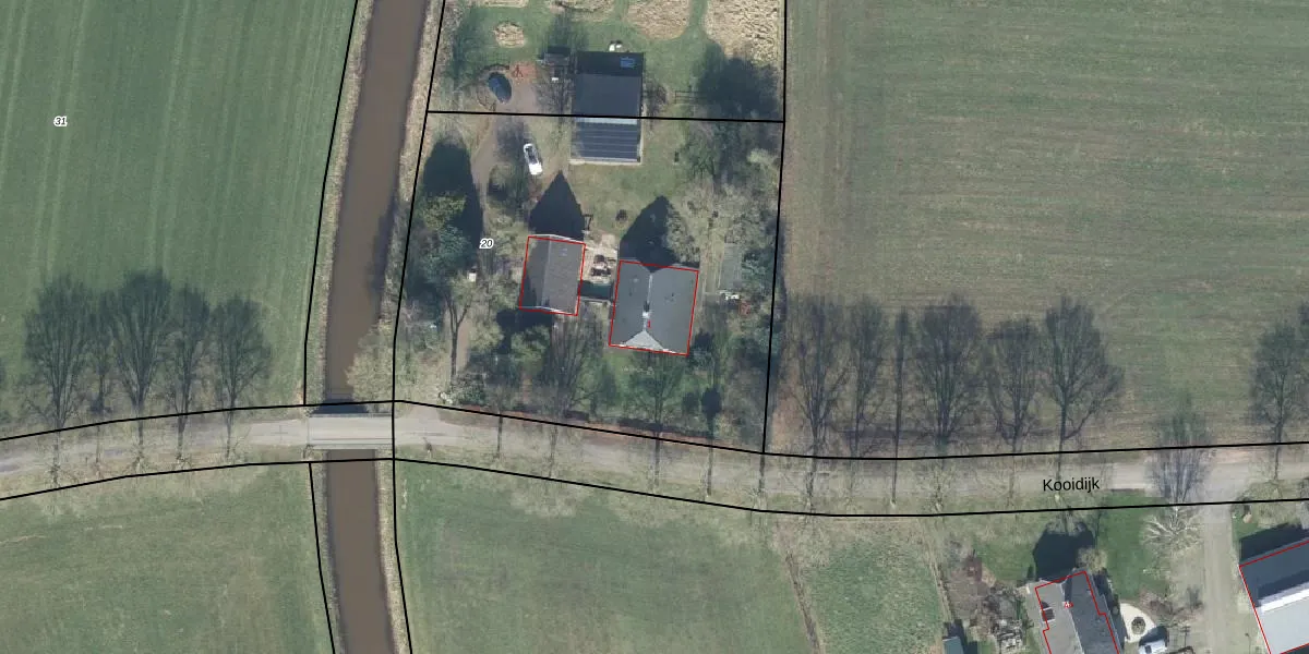 Het perceel waarop Kooidijk 1 staat heeft een oppervlakte van 2680 m². Dit is een zeer groot perceel. De perceeloppervlakte wordt geregistreerd door het Kadaster. Gedetailleerde informatie over de maten van dit perceel kunt u vinden in het rapport Kadastrale kaart met maatvoering van Kooidijk 1.
