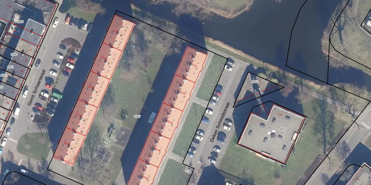 Het perceel waarop Deken Schmidtstraat 14-A staat heeft een oppervlakte van 6334 m². Dit is een zeer groot perceel. De perceeloppervlakte wordt geregistreerd door het Kadaster. Gedetailleerde informatie over de maten van dit perceel kunt u vinden in het rapport Kadastrale kaart met maatvoering van Deken Schmidtstraat 14-A.