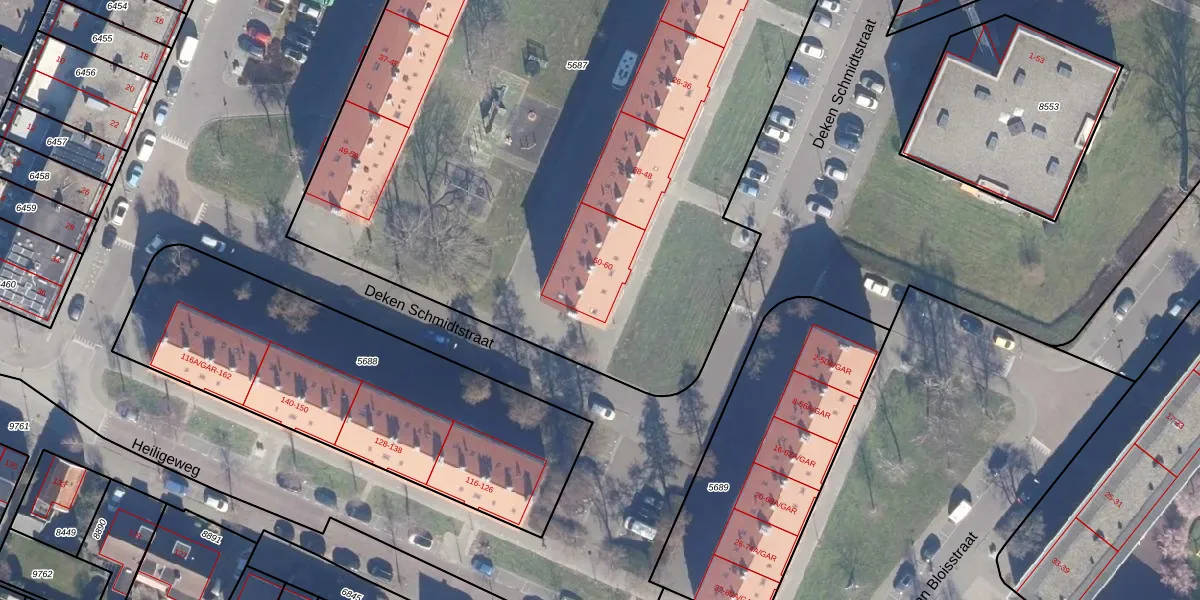 Het perceel waarop Deken Schmidtstraat 56-B staat heeft een oppervlakte van 6334 m². Dit is een zeer groot perceel. De perceeloppervlakte wordt geregistreerd door het Kadaster. Gedetailleerde informatie over de maten van dit perceel kunt u vinden in het rapport Kadastrale kaart met maatvoering van Deken Schmidtstraat 56-B.