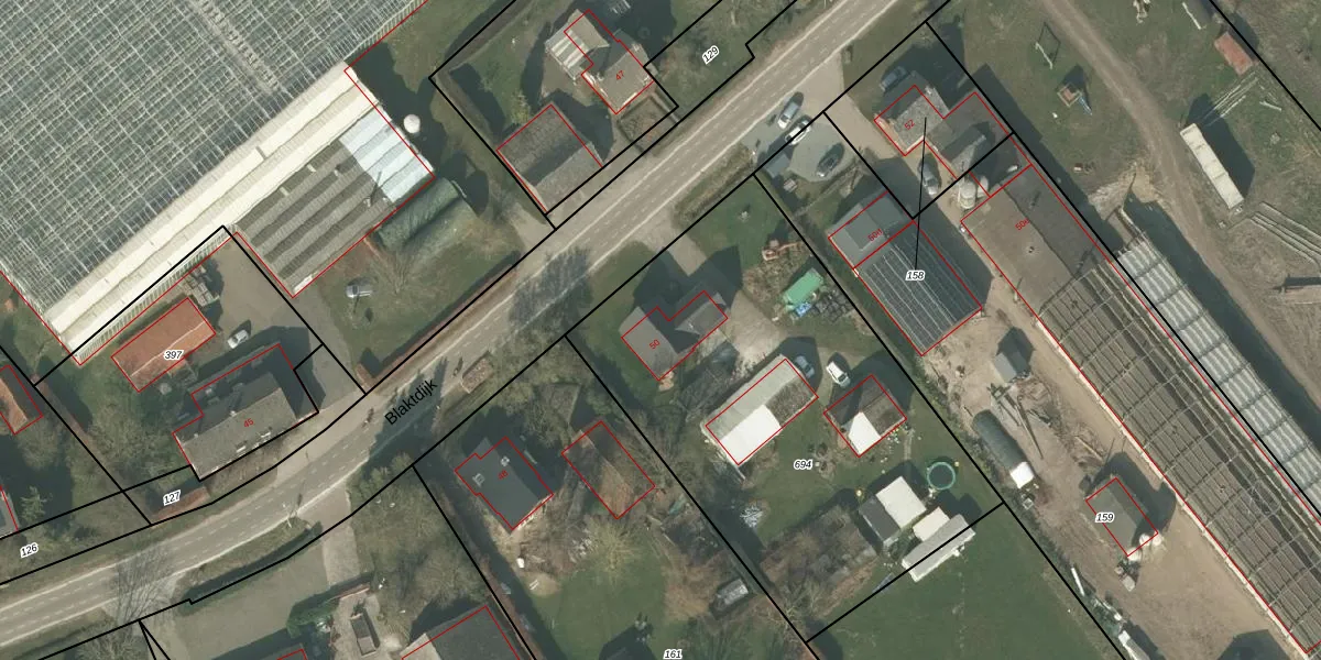 Het perceel waarop Blaktdijk 50 staat heeft een oppervlakte van 2265 m². Dit is een zeer groot perceel. De perceeloppervlakte wordt geregistreerd door het Kadaster. Gedetailleerde informatie over de maten van dit perceel kunt u vinden in het rapport Kadastrale kaart met maatvoering van Blaktdijk 50.