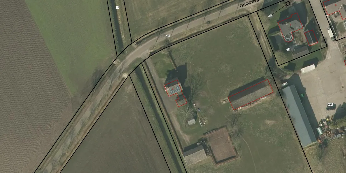 Het perceel waarop Gruttoweg 4 staat heeft een oppervlakte van 9702 m². Dit is een zeer groot perceel. De perceeloppervlakte wordt geregistreerd door het Kadaster. Gedetailleerde informatie over de maten van dit perceel kunt u vinden in het rapport Kadastrale kaart met maatvoering van Gruttoweg 4.