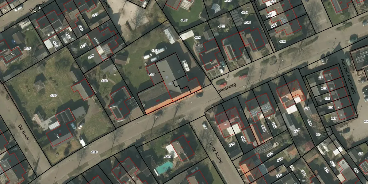 Het perceel waarop Meerweg 26 staat heeft een oppervlakte van 451 m². Dit is een groot perceel. De perceeloppervlakte wordt geregistreerd door het Kadaster. Gedetailleerde informatie over de maten van dit perceel kunt u vinden in het rapport Kadastrale kaart met maatvoering van Meerweg 26.