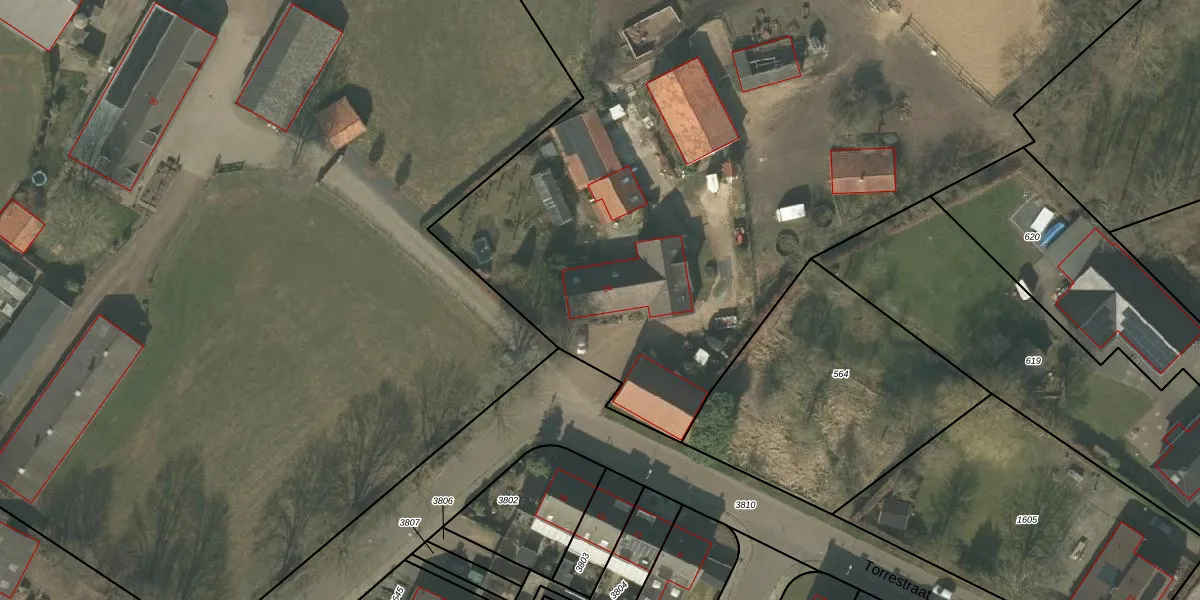 Het perceel waarop Torrestraat 24 staat heeft een oppervlakte van 1,2 ha. Dit is een zeer groot perceel. De perceeloppervlakte wordt geregistreerd door het Kadaster. Gedetailleerde informatie over de maten van dit perceel kunt u vinden in het rapport Kadastrale kaart met maatvoering van Torrestraat 24.
