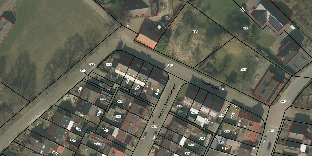 Torrestraat 9 is gelegen op kadastraal perceel SVN01G3805. Deze kadastrale aanduiding is uniek en wordt gebruikt door het Kadaster om eigendomsrechten en andere zakelijke rechten vast te leggen. Het perceel maakt onderdeel uit van de kadastrale gemeente Sevenum.