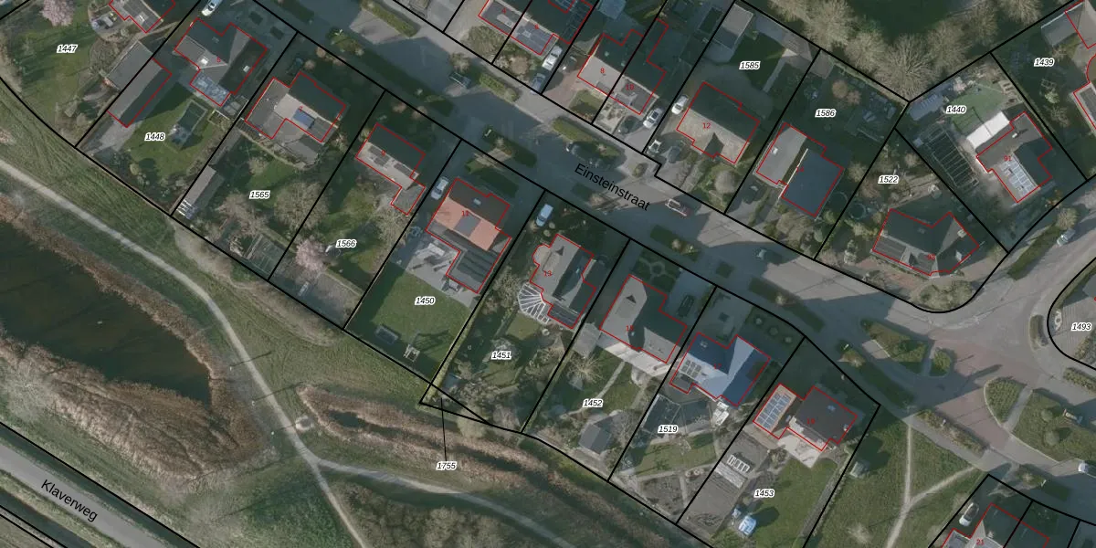 Het perceel waarop Einsteinstraat 13 staat heeft een oppervlakte van 766 m². Dit is een groot perceel. De perceeloppervlakte wordt geregistreerd door het Kadaster. Gedetailleerde informatie over de maten van dit perceel kunt u vinden in het rapport Kadastrale kaart met maatvoering van Einsteinstraat 13.