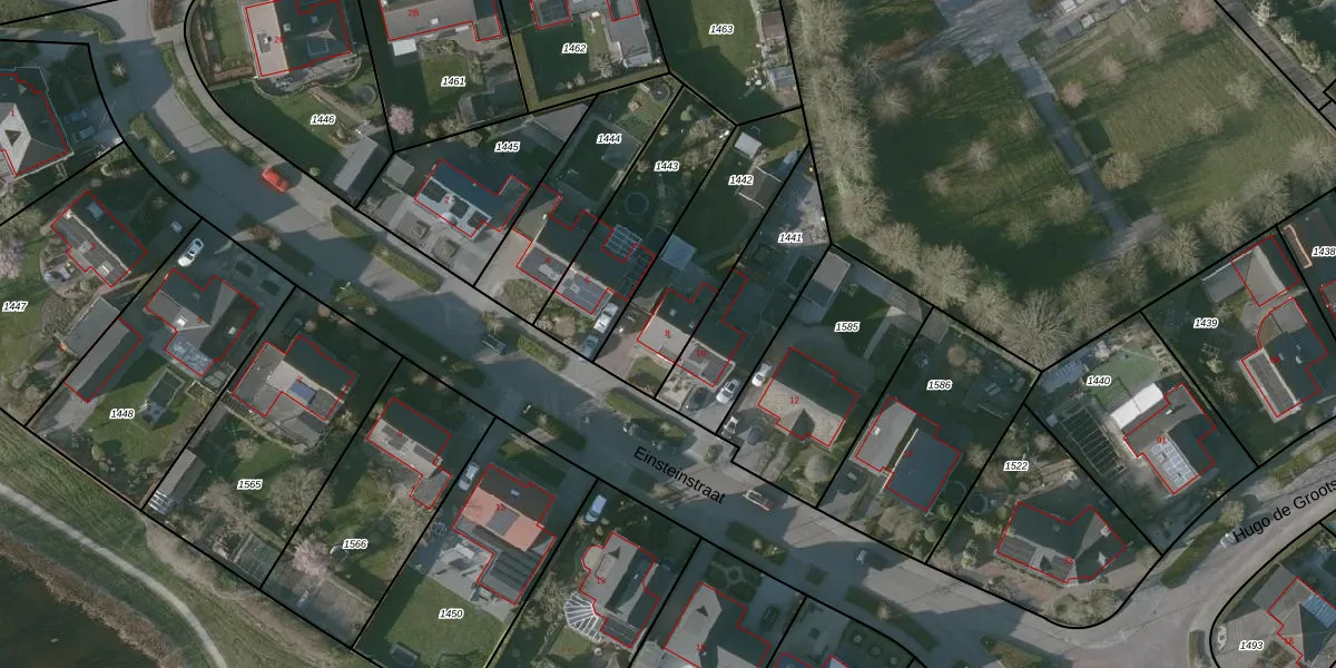 Het perceel waarop Einsteinstraat 8 staat heeft een oppervlakte van 488 m². Dit is een groot perceel. De perceeloppervlakte wordt geregistreerd door het Kadaster. Gedetailleerde informatie over de maten van dit perceel kunt u vinden in het rapport Kadastrale kaart met maatvoering van Einsteinstraat 8.