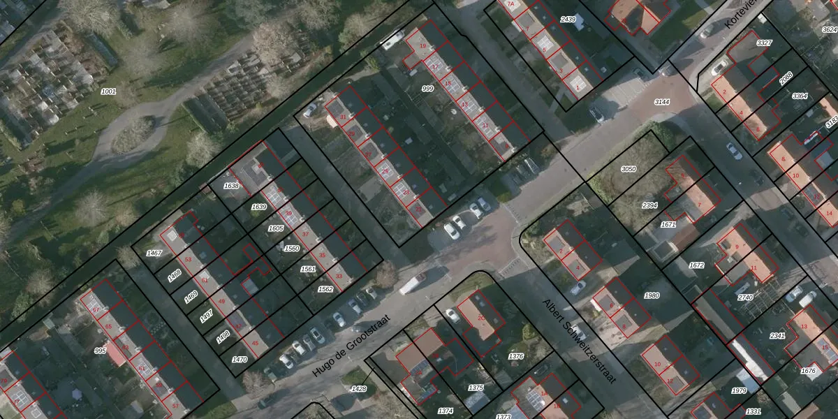 Het perceel waarop Hugo de Grootstraat 21 staat heeft een oppervlakte van 1785 m². Dit is een zeer groot perceel. De perceeloppervlakte wordt geregistreerd door het Kadaster. Gedetailleerde informatie over de maten van dit perceel kunt u vinden in het rapport Kadastrale kaart met maatvoering van Hugo de Grootstraat 21.