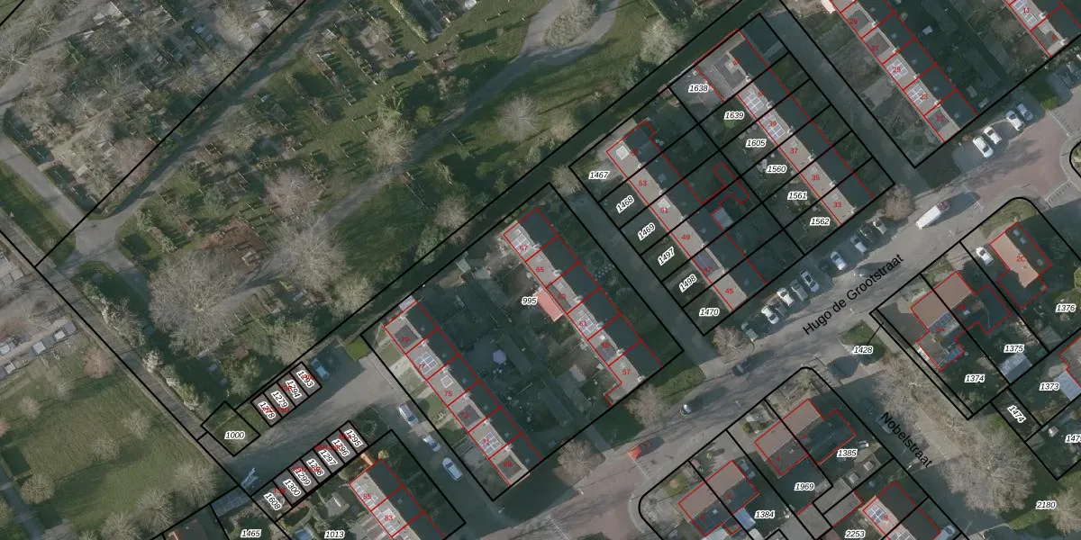 Het perceel waarop Hugo de Grootstraat 65 staat heeft een oppervlakte van 1770 m². Dit is een zeer groot perceel. De perceeloppervlakte wordt geregistreerd door het Kadaster. Gedetailleerde informatie over de maten van dit perceel kunt u vinden in het rapport Kadastrale kaart met maatvoering van Hugo de Grootstraat 65.
