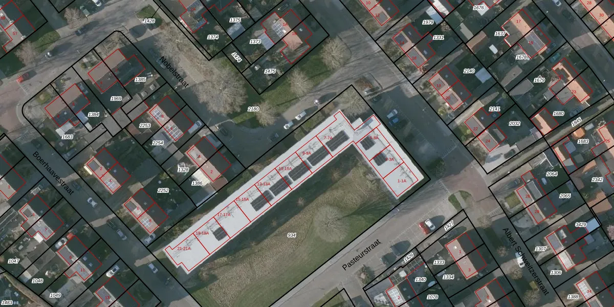 Het perceel waarop Pasteurstraat 9 staat heeft een oppervlakte van 3380 m². Dit is een zeer groot perceel. De perceeloppervlakte wordt geregistreerd door het Kadaster. Gedetailleerde informatie over de maten van dit perceel kunt u vinden in het rapport Kadastrale kaart met maatvoering van Pasteurstraat 9.