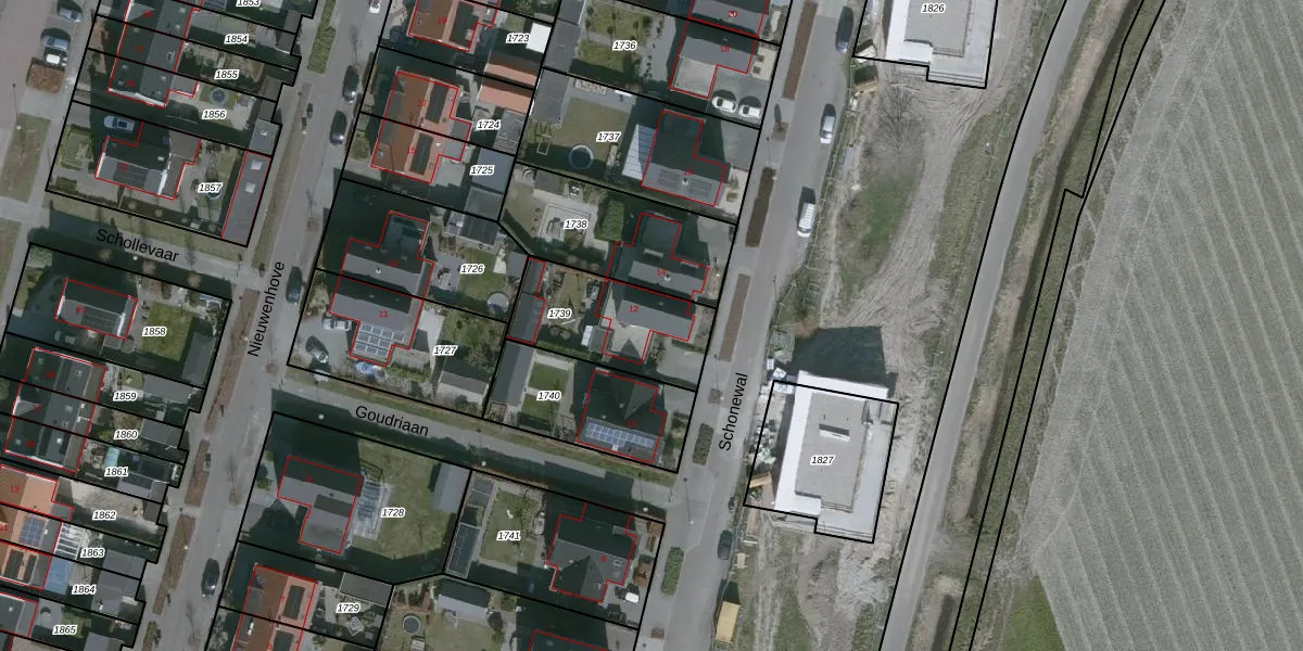 Het perceel waarop Schonewal 12 staat heeft een oppervlakte van 401 m². Dit is een groot perceel. De perceeloppervlakte wordt geregistreerd door het Kadaster. Gedetailleerde informatie over de maten van dit perceel kunt u vinden in het rapport Kadastrale kaart met maatvoering van Schonewal 12.