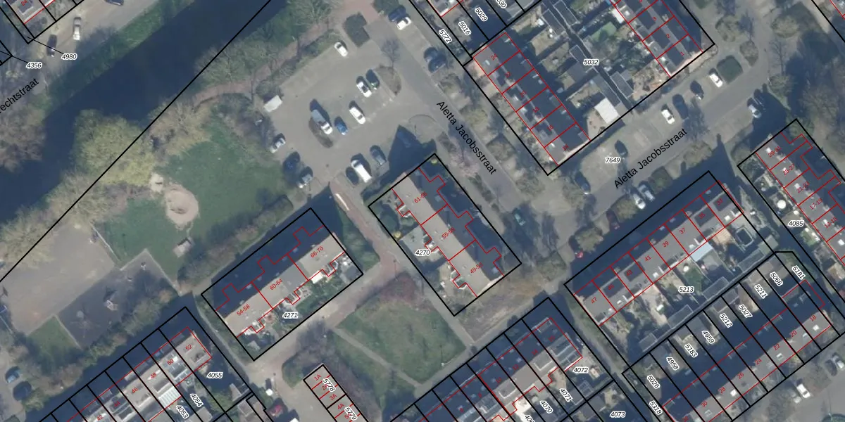 Het perceel waarop Aletta Jacobsstraat 63 staat heeft een oppervlakte van 659 m². Dit is een groot perceel. De perceeloppervlakte wordt geregistreerd door het Kadaster. Gedetailleerde informatie over de maten van dit perceel kunt u vinden in het rapport Kadastrale kaart met maatvoering van Aletta Jacobsstraat 63.