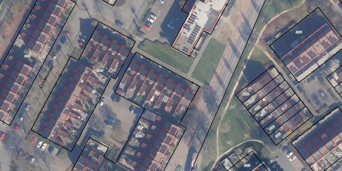 Het perceel waarop Einsteinstraat 33 staat heeft een oppervlakte van 3208 m². Dit is een zeer groot perceel. De perceeloppervlakte wordt geregistreerd door het Kadaster. Gedetailleerde informatie over de maten van dit perceel kunt u vinden in het rapport Kadastrale kaart met maatvoering van Einsteinstraat 33.