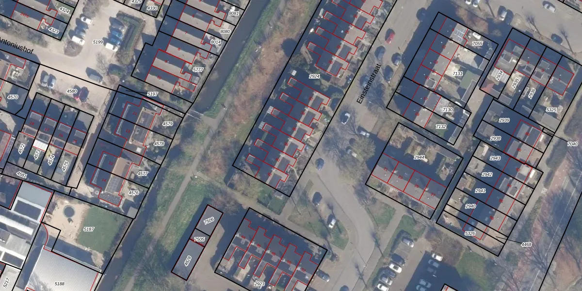 Het perceel waarop Einsteinstraat 38 staat heeft een oppervlakte van 1805 m². Dit is een zeer groot perceel. De perceeloppervlakte wordt geregistreerd door het Kadaster. Gedetailleerde informatie over de maten van dit perceel kunt u vinden in het rapport Kadastrale kaart met maatvoering van Einsteinstraat 38.