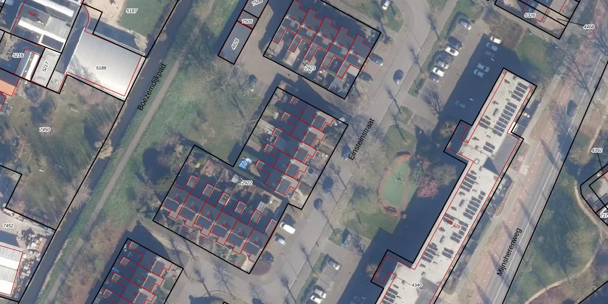 Het perceel waarop Einsteinstraat 58 staat heeft een oppervlakte van 1877 m². Dit is een zeer groot perceel. De perceeloppervlakte wordt geregistreerd door het Kadaster. Gedetailleerde informatie over de maten van dit perceel kunt u vinden in het rapport Kadastrale kaart met maatvoering van Einsteinstraat 58.