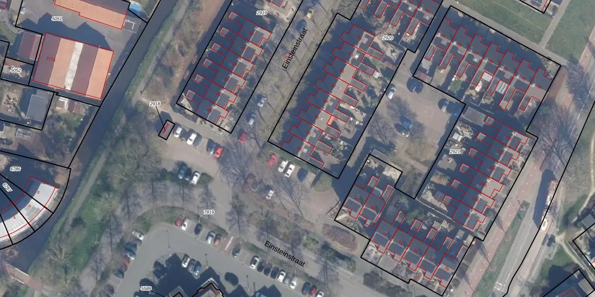 Het perceel waarop Einsteinstraat 65 staat heeft een oppervlakte van 1942 m². Dit is een zeer groot perceel. De perceeloppervlakte wordt geregistreerd door het Kadaster. Gedetailleerde informatie over de maten van dit perceel kunt u vinden in het rapport Kadastrale kaart met maatvoering van Einsteinstraat 65.