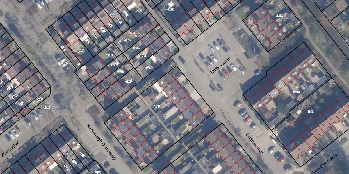 Het perceel waarop Einthovenhof 12 staat heeft een oppervlakte van 1830 m². Dit is een zeer groot perceel. De perceeloppervlakte wordt geregistreerd door het Kadaster. Gedetailleerde informatie over de maten van dit perceel kunt u vinden in het rapport Kadastrale kaart met maatvoering van Einthovenhof 12.