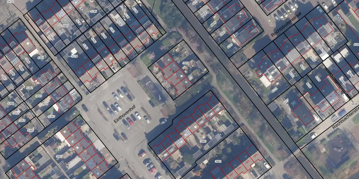 Het perceel waarop Einthovenhof 30 staat heeft een oppervlakte van 590 m². Dit is een groot perceel. De perceeloppervlakte wordt geregistreerd door het Kadaster. Gedetailleerde informatie over de maten van dit perceel kunt u vinden in het rapport Kadastrale kaart met maatvoering van Einthovenhof 30.