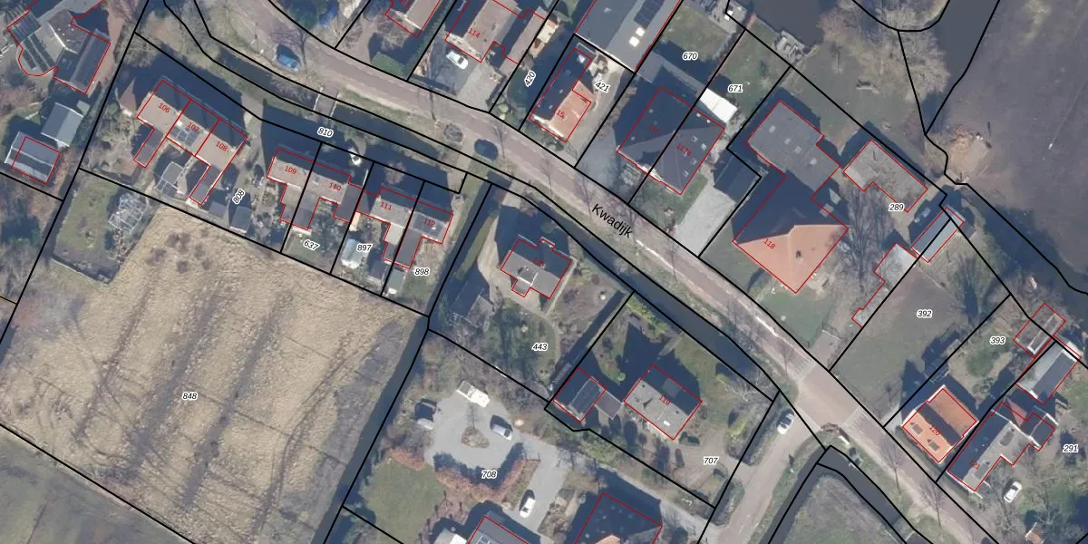 Kwadijk 116 is gelegen op kadastraal perceel KDK01B443. Deze kadastrale aanduiding is uniek en wordt gebruikt door het Kadaster om eigendomsrechten en andere zakelijke rechten vast te leggen. Het perceel maakt onderdeel uit van de kadastrale gemeente Kwadijk.