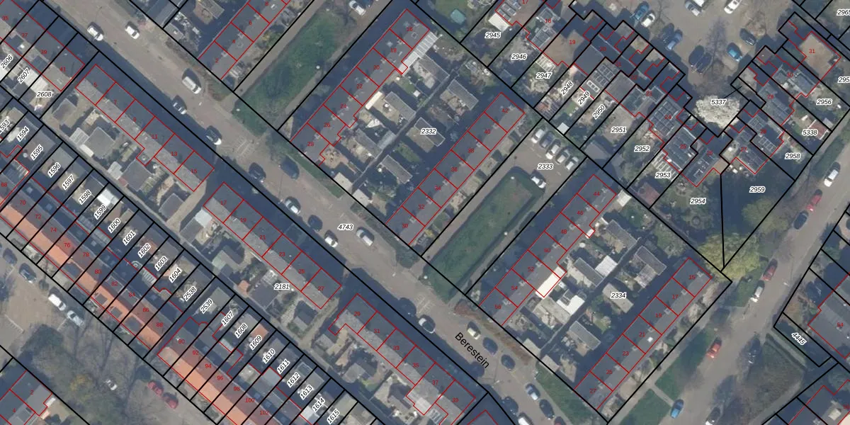 Het perceel waarop Berestein 32 staat heeft een oppervlakte van 1969 m². Dit is een zeer groot perceel. De perceeloppervlakte wordt geregistreerd door het Kadaster. Gedetailleerde informatie over de maten van dit perceel kunt u vinden in het rapport Kadastrale kaart met maatvoering van Berestein 32.