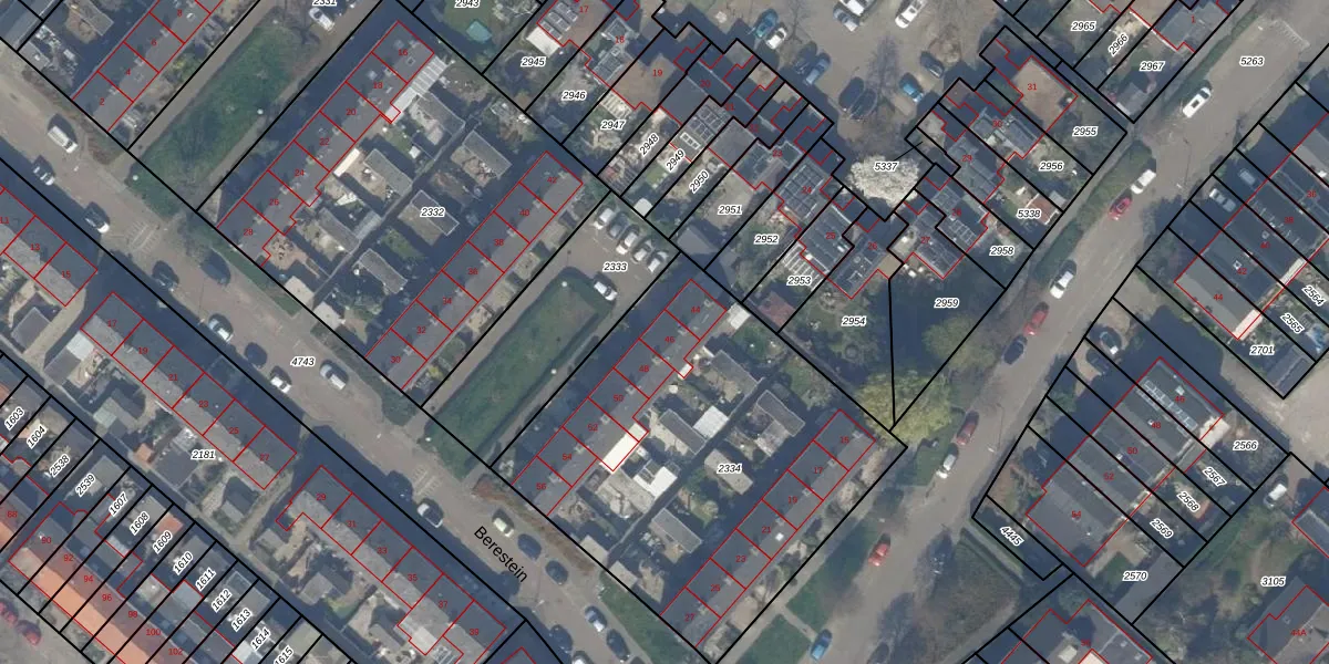 Het perceel waarop Berestein 46 staat heeft een oppervlakte van 1969 m². Dit is een zeer groot perceel. De perceeloppervlakte wordt geregistreerd door het Kadaster. Gedetailleerde informatie over de maten van dit perceel kunt u vinden in het rapport Kadastrale kaart met maatvoering van Berestein 46.