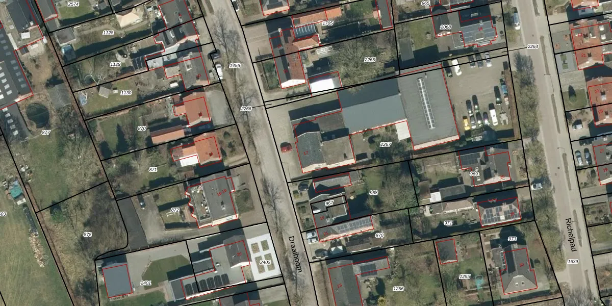 Het perceel waarop Draaiboom 17 staat heeft een oppervlakte van 2150 m². Dit is een zeer groot perceel. De perceeloppervlakte wordt geregistreerd door het Kadaster. Gedetailleerde informatie over de maten van dit perceel kunt u vinden in het rapport Kadastrale kaart met maatvoering van Draaiboom 17.