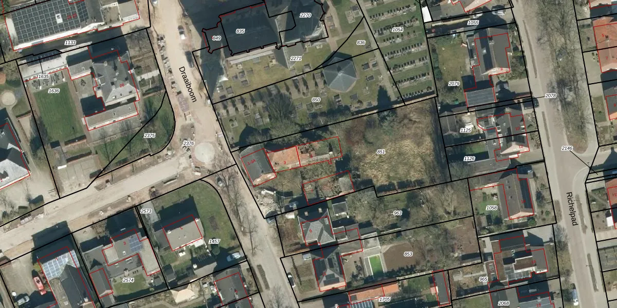 Het perceel waarop Draaiboom 5-A staat heeft een oppervlakte van 1632 m². Dit is een zeer groot perceel. De perceeloppervlakte wordt geregistreerd door het Kadaster. Gedetailleerde informatie over de maten van dit perceel kunt u vinden in het rapport Kadastrale kaart met maatvoering van Draaiboom 5-A.