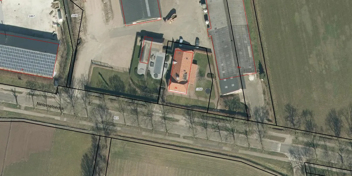 Neterselsedijk 39 is gelegen op kadastraal perceel MDE02K1356. Deze kadastrale aanduiding is uniek en wordt gebruikt door het Kadaster om eigendomsrechten en andere zakelijke rechten vast te leggen. Het perceel maakt onderdeel uit van de kadastrale gemeente Hooge en Lage Mierde.