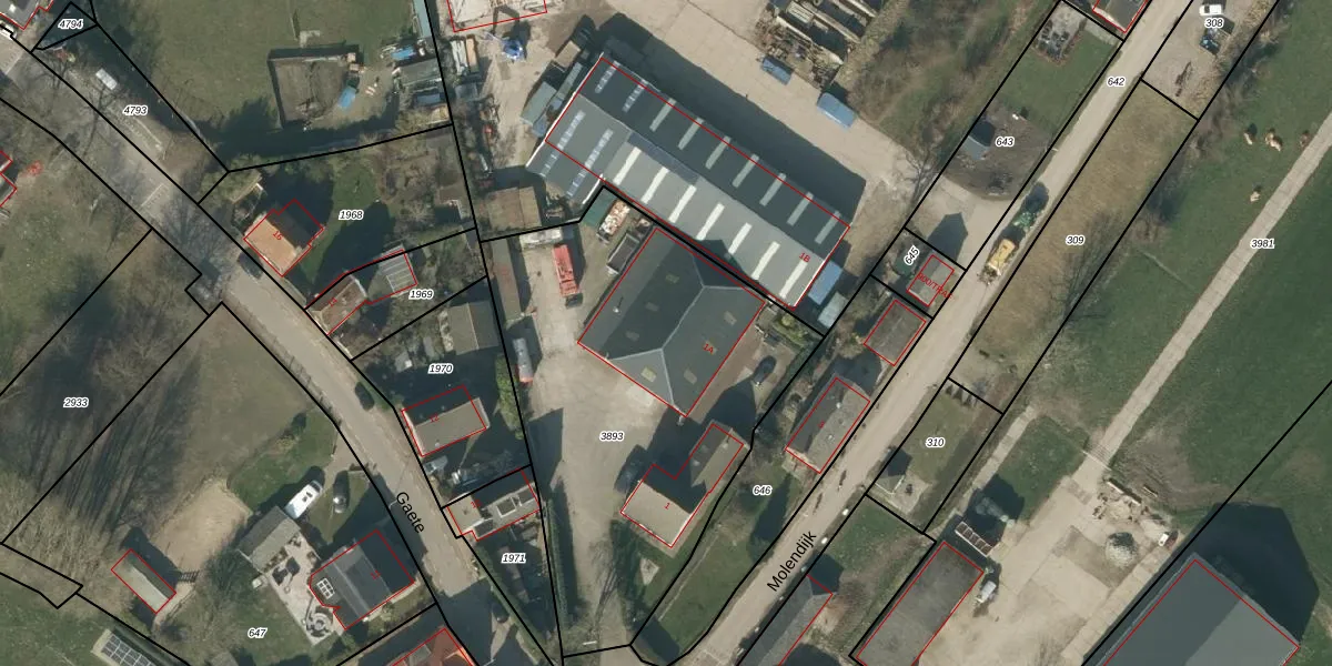 Het perceel waarop Molendijk 1-A staat heeft een oppervlakte van 1990 m². Dit is een zeer groot perceel. De perceeloppervlakte wordt geregistreerd door het Kadaster. Gedetailleerde informatie over de maten van dit perceel kunt u vinden in het rapport Kadastrale kaart met maatvoering van Molendijk 1-A.