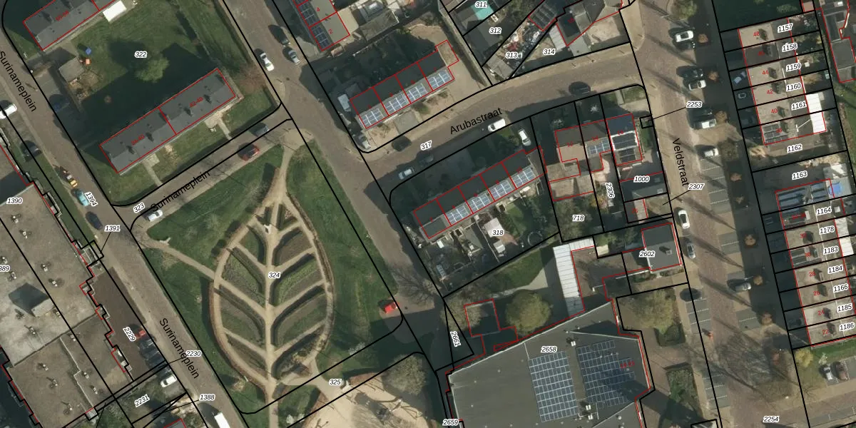 Het perceel waarop Arubastraat 2 staat heeft een oppervlakte van 990 m². Dit is een groot perceel. De perceeloppervlakte wordt geregistreerd door het Kadaster. Gedetailleerde informatie over de maten van dit perceel kunt u vinden in het rapport Kadastrale kaart met maatvoering van Arubastraat 2.