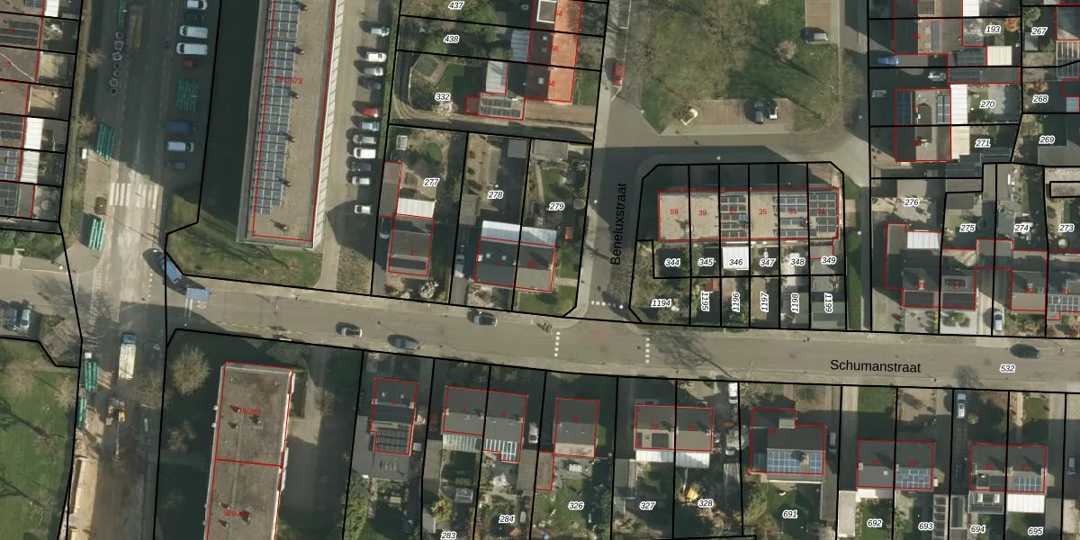 Het perceel waarop Beneluxstraat 60 staat heeft een oppervlakte van 384 m². Dit is een groot perceel. De perceeloppervlakte wordt geregistreerd door het Kadaster. Gedetailleerde informatie over de maten van dit perceel kunt u vinden in het rapport Kadastrale kaart met maatvoering van Beneluxstraat 60.